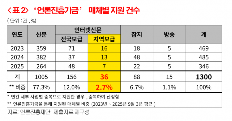 º¸±Þ Áö¿ªÀ» Àü±¹ÀÌ ¾Æ´Ñ Áö¿ªÀ¸·Î µÎ°í ÀÖ´Â 'Áö¿ª ÀÎÅÍ³Ý ½Å¹®'ÀÇ »óȲÀº ´õ¿í ½É°¢ÇÏ´Ù. ÀÎÅÍ³Ý ¸Åü´Â '¾ð·ÐÁøÈï±â±Ý'À» ÅëÇØ Áö¿øµÇ´Âµ¥, 2023³âºÎÅÍ 2025³â±îÁö 3³â µ¿¾È ÇØ´ç ±â±ÝÀÌ °¢ ¸Åü¿¡ Áö¿øÇÑ 1,300°Ç Áß ¡®Áö¿ª ÀÎÅÍ³Ý ½Å¹®¡¯ ¸Åü¿¡ ´ëÇÑ Áö¿ø °Ç¼ö´Â 36°Ç, Àüü Áö¿ø °Ç¼ö¿¡¼ Â÷ÁöÇÏ´Â ºñÁßÀÌ 2.7%¿¡ ºÒ°úÇÏ´Ù.