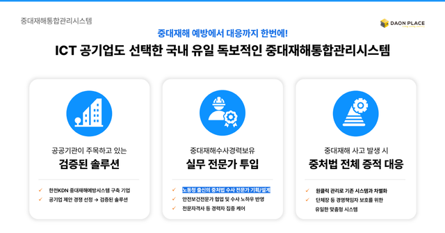 Áß´ëÀçÇØÅëÇÕ°ü¸®½Ã½ºÅÛÀº ³ëµ¿Ã» Áß´ëÀçÇØ ¼ö»çÆÀÀå Ãâ½Å ÀÌÀç¿ø Àü¹®°¡°¡ Á÷Á¢ ¼³°è¿¡ Âü¿©ÇØ, ±âÁ¸ ¡®»ç°í ÈÄ ´ëÀÀ¡¯ Áß½ÉÀÇ Ã¼°è¸¦ ³Ñ¾î ¡®»ç°í »çÀü Â÷´Ü¡¯ Áß½ÉÀÇ µ¥ÀÌÅÍ ±â¹Ý ¾ÈÀü°ü¸®Ã¼°è¸¦ ±¸ÇöÇß´Ù.