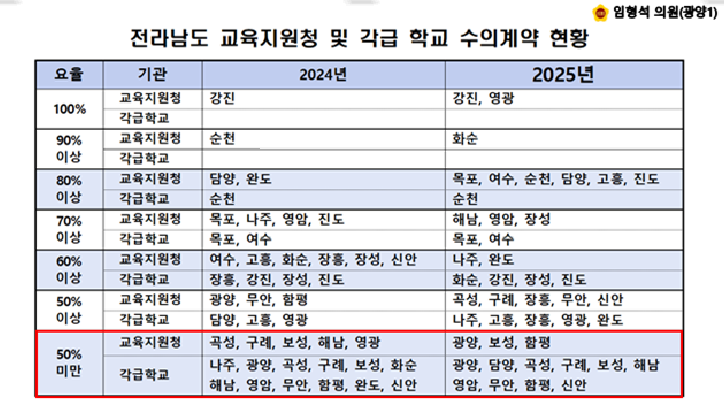 ÀÓÇü¼® ÀÇ¿ø(´õºÒ¾î¹ÎÁÖ´ç¤ý±¤¾ç1)ÀÌ Àü³²µµ±³À°Ã»¿¡¼ ¡®±³À°Áö¿øÃ»°ú ±× ¼Ò¼Ó±â°ü(°¢±ÞÇб³ Æ÷ÇÔ)ÀÇ 2õ¸¸¿ø ÀÌÇÏ ¼öÀǰè¾à ÇöȲ¡¯À» Á¦Ãâ¹Þ¾Æ Áö¿ª¾÷ü¿ÍÀÇ ¼öÀǰè¾à ºñÀ²À» ºÐ¼®ÇÑ °á°ú, 2025³â 8¿ù ¸» ±âÁØ °Áø°ú ¿µ±¤±³À°Áö¿øÃ»ÀÇ ¼öÀǰè¾àÀº ¸ðµÎ Áö¿ª(°ü³») ¾÷ü¿ÍÀÇ °è¾àÀÎ °ÍÀ¸·Î ³ªÅ¸³µ´Ù.