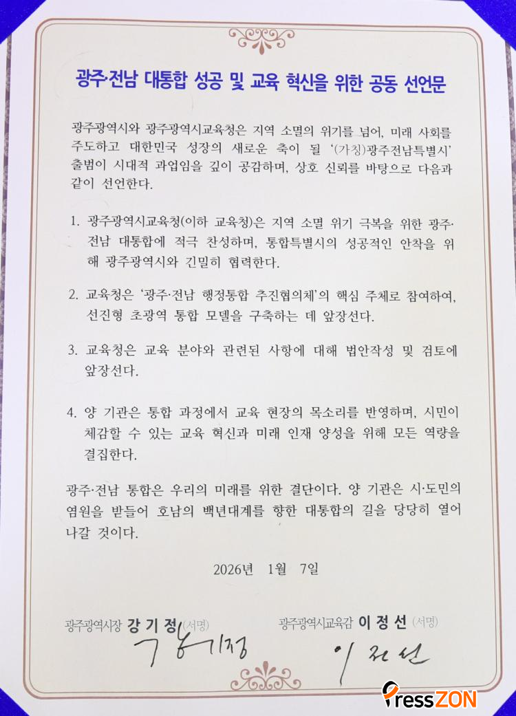 ÀÌÁ¤¼± ±¤Áֽñ³À°°¨°ú °±âÁ¤ ±¤ÁÖ½ÃÀåÀº 7ÀÏ ½Ãû ºñÁî´Ï½º·ë¿¡¼ ¸¸³ª ¡®±¤ÁÖ¡¤Àü³² ´ëÅëÇÕ ¼º°ø ¹× ±³À° Çõ½ÅÀ» À§ÇÑ °øµ¿ÇÕÀǹ®¡¯¿¡ ¼¸íÇß´Ù.