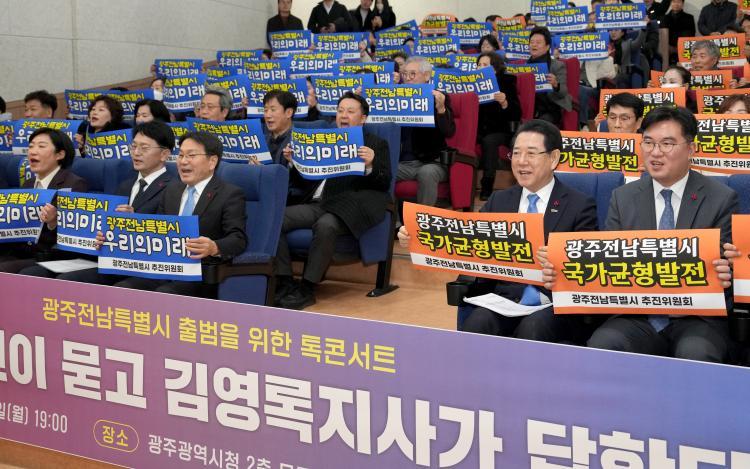 ¿À½Â¿ë ±¤ÁÖ¡¤Àü³²Æ¯º°½Ã ÃßÁøÀ§¿øÈ¸ »óÀÓ´ëÇ¥¿Í ´ë´ã Çü½ÄÀ¸·Î ÁøÇàµÈ ÅäÅ©ÄܼƮ¿¡¼ ±è Áö»ç´Â ±¤ÁÖ¡¤Àü³² ÇàÁ¤ÅëÇÕÀÇ ÃßÁø ¹è°æ°ú Çʿ伺, ÇâÈÄ ÀýÂ÷¿Í ÁÖ¿ä ÀïÁ¡,Áö¿ª ±ÕÇü¹ßÀü ¹æ¾È, ÁֹΠÀǰ߼ö·Å °èȹ, Ưº°¹ýÀ» ÅëÇÑ ÁÖ¿ä Æ¯·Ê »çÇ× µîÀ» ¼³¸íÇß´Ù.