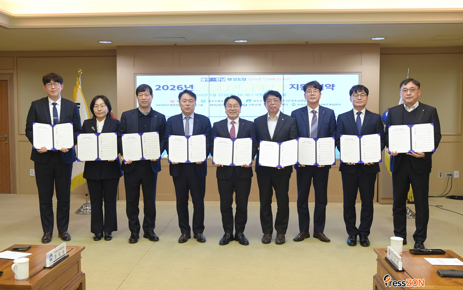 ±¤ÁÖ±¤¿ª½Ã(½ÃÀå °±âÁ¤)´Â 22ÀÏ ½Ãû ºñÁî´Ï½º·ë¿¡¼ ±¤ÁÖÀºÇà, ÇϳªÀºÇà, KB±¹¹ÎÀºÇà, NH³óÇùÀºÇà, ½ÅÇÑÀºÇà, īī¿À¹ðÅ©, ¿ì¸®ÀºÇà µî 7°³ ±ÝÀ¶±â°ü ¹× ±¤Áֽſ뺸ÁõÀç´Ü°ú ¡®2026³â ¼Ò»ó°øÀΠƯ·Êº¸Áõ Áö¿ø Çù¾à¡¯À» ü°áÇß´Ù.