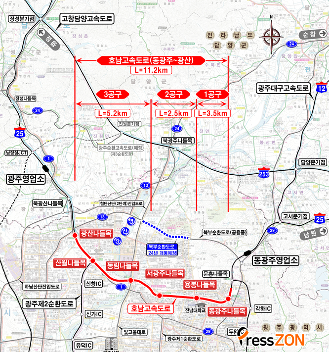 È£³²°í¼Óµµ·Î È®Àå°ø»ç´Â ÃÑ 7934¾ï ¿øÀ» ÅõÀÔÇØ µ¿±¤ÁÖICºÎÅÍ ±¤»êIC±îÁö ÃÑ 11.2§° ±¸°£À» ±âÁ¸ ¿Õº¹ 4Â÷·Î¿¡¼ 6Â÷·Î·Î È®ÀåÇÏ´Â ´ë±Ô¸ð µµ·Î ±â¹Ý½Ã¼³ °³¼± »ç¾÷ÀÌ´Ù. ÀÌ ±¸°£¿¡´Â ¡ãµ¿±¤ÁÖIC ¡ã¿ëºÀIC ¡ã¼±¤ÁÖIC ¡ãµ¿¸²IC ¡ã»ê¿ùIC ¡ã±¤»êIC°¡ Æ÷ÇԵǸç, °ø»ç´Â ¿À´Â 2029³â±îÁö ´Ü°èÀûÀ¸·Î ¿Ï·áÇÒ ¿¹Á¤ÀÌ´Ù.