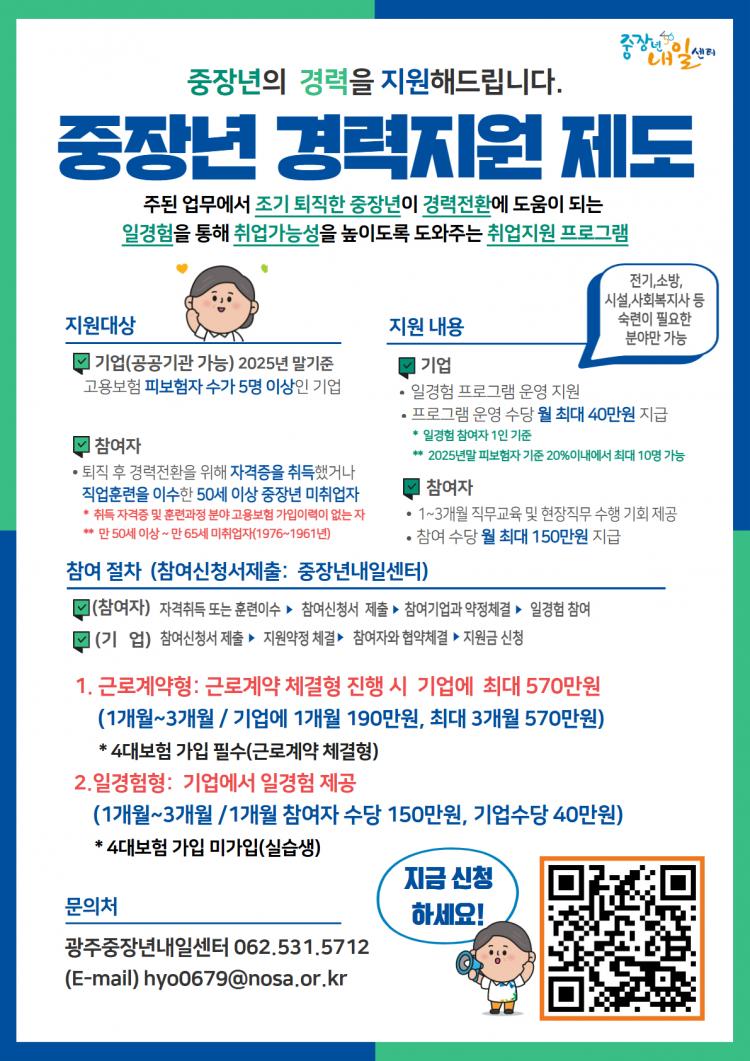 ÁßÀå³â°æ·ÂÁö¿øÁ¦´Â ÁÖµÈ ¾÷¹«¿¡¼ ÅðÁ÷ ÈÄ °æ·Â ÀüȯÀ» À§ÇØ ÀÚ°ÝÀ» ÃëµæÇ߰ųª ÈÆ·ÃÀ» À̼öÇÑ 50´ë ÁßÀå³â¿¡°Ô ▴ÇöÀå½Ç¹«°æÇè ▴Á÷¹« ¸àÅ丵¡¤¸¶ÀÎµå ±³À° ▴µðÁöÅÐ ¿ªÇâ ±³À° µî °æ·Â ÀüȯÇü ½Ç¹« °æÇèÀ» Áö¿øÇÏ¿© Ãë¾÷ °¡´É¼ºÀ» ³ô¿©ÁÖ´Â Ãë¾÷Áö¿øÇÁ·Î±×·¥ÀÌ´Ù.