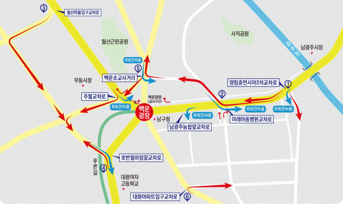 ¶ÇÇÑ, ¹é¿î°í°¡Â÷µµ ±³Â÷·Î ³» 1°÷(µ¿¾Æº´¿ø¡æ¹é¿îÃʱ³ ¹æ¸é)Àº ÁÂȸÀü ±ÝÁö½Ã۰í, ¹é¿î±¤Àå ÁÖº¯ 5°÷¿¡ ´ëÇØ¼´Â ÁÂȸÀüÀ» Çã¿ëÇÏ´Â µî ÁÖº¯ ½Åȣü°è¸¦ º¯°æÇÑ´Ù.