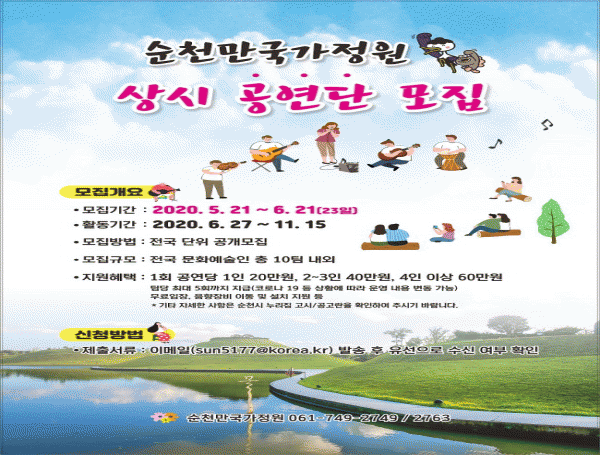 ¼øÃµ¸¸±¹°¡Á¤¿ø »ó½Ã °ø¿¬´ÜÀ¸·Î ¼±¹ßµÇ¸é ÃÖ´ë 5ȸÀÇ °ø¿¬ ±âȸ¿Í ¼ÒÁ¤ÀÇ È°µ¿ºñ¸¦ Áö¿ø¹ÞÀ» ¼ö ÀÖÀ¸¸ç, 6¿ù 27ÀϺÎÅÍ ±¹°¡Á¤¿øÀ» ¹«´ë·Î ¸ÅÁÖ ÁÖ¸»°ú °øÈÞÀÏ¿¡ °ü¶÷°´µéÀ» ¸¸³¯ ¼ö ÀÖ´Ù.