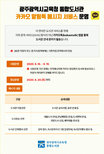 ±¤ÁÖÇлý±³À°¹®Èȸ°üÀº ¡®¾Ë¸²Åå ¸Þ½ÃÁö ¼ºñ½º¡¯¸¦ ÅëÇØ ´ëÃâµµ¼?¹Ý³³¿¹Á¤ÀÏ?µµ¼¿¬Ã¼?¿¹¾à´ëÃâ?Èñ¸Áµµ¼ ½Åû µî °¢Á¾ µµ¼ Á¤º¸¸¦ ¾È³»ÇÒ ¿¹Á¤ÀÌ´Ù.