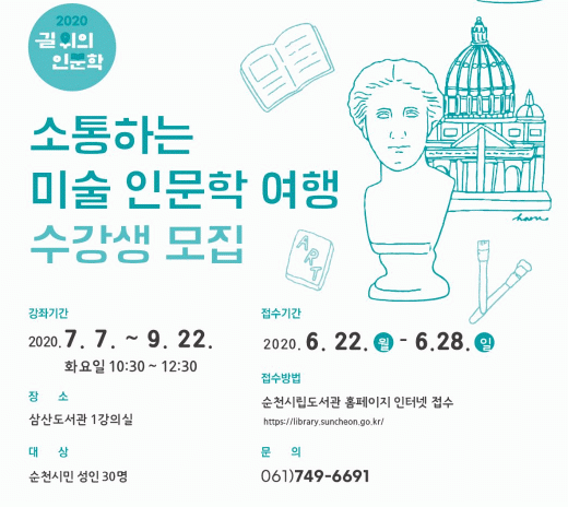 ¼øÃµ½Ã¹Î Áß ¹Ì¼ú¿¡ °ü½ÉÀÌ ÀÖ´Â ¼ºÀÎ 30¸íÀ» ´ë»óÀ¸·Î 7¿ù 7ÀϺÎÅÍ 9¿ù 22ÀϱîÁö ¸ÅÁÖ È¿äÀÏ 10:30~12:30ºÐ±îÁö ÃÑ 12ȸ ¿î¿µµÈ´Ù. Âü¿©¸¦ ¿øÇÏ´Â ½Ã¹ÎµéÀº 6¿ù 22ÀϺÎÅÍ ¼øÃµ½Ã¸³ µµ¼°ü ȨÆäÀÌÁö¸¦ ÅëÇØ Á¢¼öÇÏ¸é µÈ´Ù.