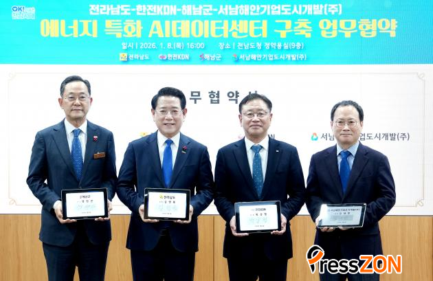 [ÇÁ·¹½ºÁ¸] Àü¶ó³²µµ´Â 8ÀÏ µµÃ»¿¡¼ ±è¿µ·Ï Àü³²µµÁö»ç, ¹Ú»óÇü ÇÑÀüKDN »çÀå, ¸íÇö°ü ÇØ³²±º¼ö, ±è´ëÇÑ ¼³²Çؾȱâ¾÷µµ½Ã°³¹ß¢ß ´ëÇ¥°¡ Âü¼®ÇÑ °¡¿îµ¥ KDN, ÇØ³²±º, ¼³²Çؾȱâ¾÷µµ½Ã°³¹ß¢ß¿Í ¿¡³ÊÁö Æ¯È AI µ¥ÀÌÅͼ¾ÅÍ ±¸Ãà ¹× AI¡¤¿¡³ÊÁö ½Å»ê¾÷ À°¼ºÀ» À§ÇÑ ¾÷¹«Çù¾àÀ» ü°áÇß´Ù.