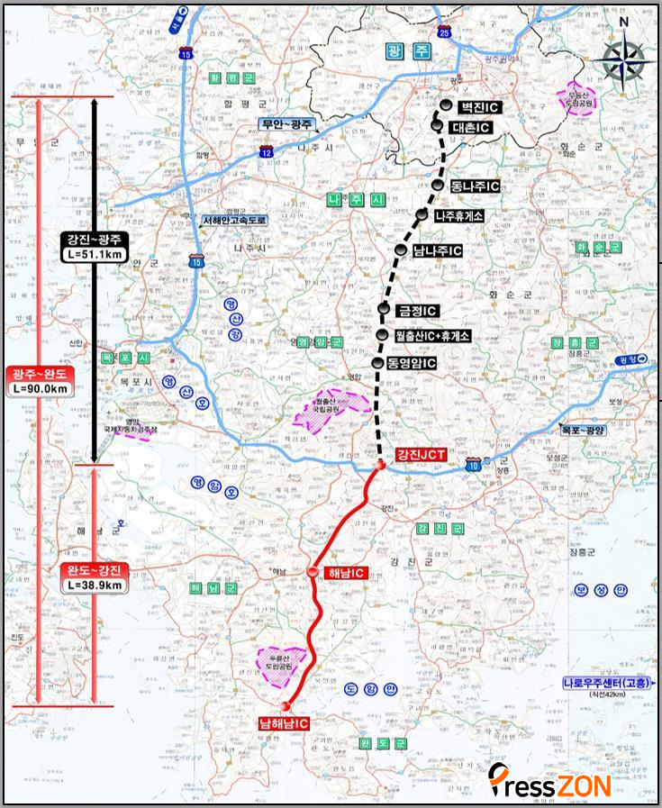 20ÀÏ Àü¶ó³²µµ ÇØ³²±º¿¡ µû¸£¸é ¿ÃÇØ ¿Ï°øµÇ´Â ³ë¼±Àº ±¤ÁÖ±¤¿ª½Ã ¼±¸ º®Áøµ¿¿¡¼ Ãâ¹ßÇØ °Áø±º ¼ºÀü¸é¿¡¼ ³²Çذí¼Óµµ·Î¿Í ºÐ±âÁ¡(JCT)À¸·Î ¿¬°áµÉ ¿¹Á¤ÀÌ´Ù.