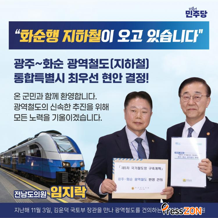 ȼø±º¼ö Ã⸶¿¹Á¤ÀÚÀÎ ÀÓ ÀÇ¿øÀº Áö³ÇØ 11¿ù 3ÀÏ ±èÀ±´ö ±¹Åä±³ÅëºÎ Àå°üÀ» ¸¸³ª ±¤ÁÖ~ȼø ±¤¿ªÃ¶µµ(ÁöÇÏö)¸¦ Á¦5Â÷ ±¹°¡Ã¶µµ¸Á ±¸Ãà°èȹ¿¡ ¹Ý¿µÇØ ÁÙ °ÍÀ» °ÇÀÇÇß´Ù.