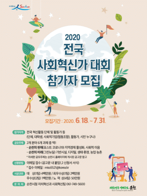 Âü°¡ÀÚ´Â Àü±¹ÀÇ Çõ½Å Ȱµ¿°¡, ´Üü, ½Ã¹Î µîÀ» ´ë»óÀ¸·Î ¸ðÁýÇÑ´Ù. ½ÅûÀº 6¿ù 18ÀϺÎÅÍ 7¿ù 31ÀϱîÁö·Î ¼øÃµ½Ã ȨÆäÀÌÁö¿¡¼ °ø¸ðÀü ½Åû¼¸¦ ´Ù¿î¹Þ¾Æ ¹ßÇ¥±âȹ¾È°ú ÇÔ²² À̸ÞÀÏ(miso5521@korea.kr)·Î Á¢¼öÇÏ¸é µÈ´Ù.