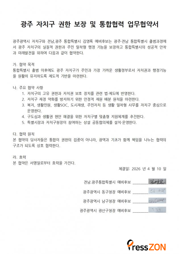 [ÇÁ·¹½ºÁ¸] ±è¿µ·Ï ¹ÎÁÖ´ç Àü³²±¤ÁÖÆ¯º°½ÃÀå ¿¹ºñÈ帰¡ 10ÀÏ ±¤ÁÖ ÀÚÄ¡±¸ÀÇ ½ÇÁúÀû ±ÇÇÑ ¹× ÁֹΠ¹ÐÂøÇü ÇàÁ¤ ±â´ÉÀ» º¸ÀåÇÏ´Â ³»¿ëÀÇ Çù¾àÀ» ±¤ÁÖ ÀÚÄ¡±¸µé°ú ¸Î¾ú´Ù.