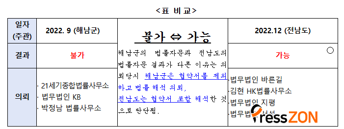 2022³â 9¿ù°ú 11¿ù ÇØ³²±º°ú Àü³²µµ´Â °¢°¢ ±â¾÷µµ½Ã³» ÃßÁø ¿¹Á¤ÀÎ ³ìÁöÁ¶¼º»ç¾÷ÀÇ ¹ý·üÀúÃË ¿©ºÎ¿¡ ´ëÇØ ¹ý·ü ÀÚ¹®À» ½Ç½ÃÇß´Ù.