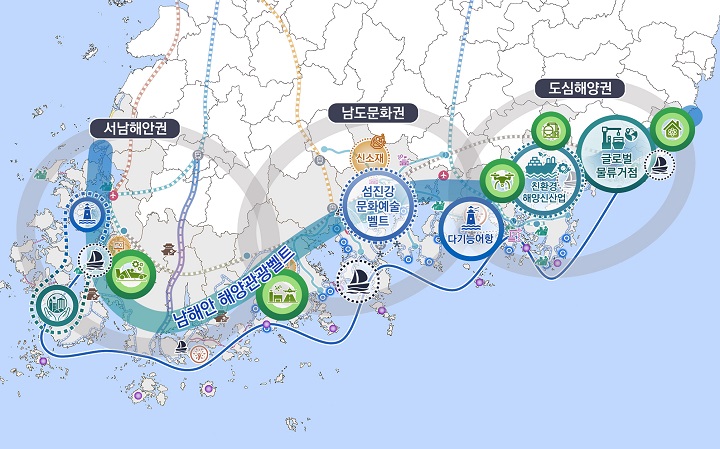 ¡®³²ÇØ¾È±Ç ¹ßÀü Á¾ÇÕ°èȹ¡¯Àº ¡®»ó»ý°ú ¹ø¿µÀÇ ³²ÇØ¾È °øµ¿Ã¼¡¯¸¦ ºñÀüÀ¸·Î Çϸç, ÁÖ¿ä ÃßÁøÀü·«À¸·Î ÇØ¾È±Ç ¿¬°è¿¡ ÀÇÇÑ ±¤¿ª°ü±¤º§Æ® Çü¼ºÀ» ºñ·Ô ¹Ì·¡Çü »ê¾÷ À°¼ºÀ» ÅëÇÑ ±¤¿ª°æÁ¦±Ç Á¶¼º, »ê¾÷ ¹× °ü±¤°ÅÁ¡ ¿¬°è ÀÎÇÁ¶ó ±¸Ãà, µ¿¼°£ »ó»ý・Çù·Âº§Æ® Á¶¼º µîÀ» Á¦½ÃÇϰí ÀÖ´Ù.