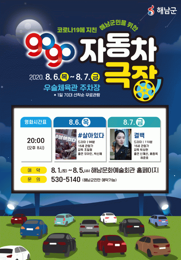 ÇØ³²±º¹ÎÀ» ´ë»óÀ¸·Î 1ÀÏ 70´ë¾¿ ÃÑ 140´ë¸¦ ¼±Âø¼øÀ¸·Î ½Åû ¹Þ¾Æ ¹«·á·Î »ó¿µÇÑ´Ù. ÇØ³²¹®È¿¹¼úȸ°ü ȨÆäÀÌÁö(http://art.haenam.go.kr)¿¡¼ 8¿ù 1ÀϺÎÅÍ 5ÀϱîÁö »çÀü ¿¹¾àÀÌ °¡´ÉÇÏ´Ù. »çÀÌÆ®´Â 8¿ù 1ÀÏ ¿ÀÀü 9½ÃºÎÅÍ ¿¹¾àÀ» ¹Þ´Â´Ù.