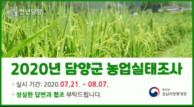 ³ó¾÷½ÇÅÂÁ¶»ç´Â ¿ÃÃÊ Åë°èû Ç¥ÁظŴº¾ó °³¹ß»ç¾÷¿¡ ´ã¾ç±ºÀÌ ¼±Á¤µÇ¾î È£³²Áö¹æÅë°èû°ú ¾÷¹«Çù¾àÀ» ¸Î°í ÁøÇàµÇ°í ÀÖÀ¸¸ç ´ã¾ç±º ³ó¾÷ Ư¼ºÀ» ¹Ý¿µÇÑ Áö¿ª¸ÂÃãÇü ³ó¾÷Åë°èÀÚ·á »ý»êÀ» ¸ñÀûÀ¸·Î ÇÑ´Ù.
