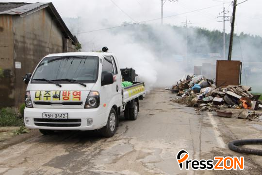 [ÇÁ·¹½ºÁ¸]³ªÁֽú¸°Ç¼Ò ¹æ¿ªÂ÷·®ÀÌ 11ÀÏ ´Ù½Ã¸é ħ¼öÇÇÇØ ¸¶À» ÇöÀå °÷°÷¿¡¼ °¨¿°º´ ¿¹¹æÀ» À§ÇÑ ´ë´ëÀûÀÎ ¹æ¿ª ¼Òµ¶ ÀÛ¾÷À» ¹úÀ̰í ÀÖ´Ù.