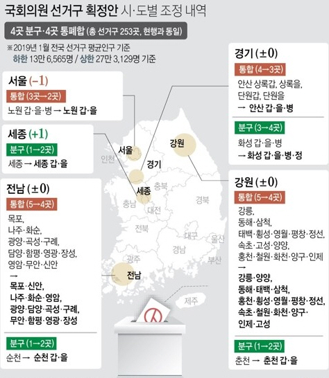 ȹÁ¤À§ÀÇ È¹Á¤¾È¿¡ µû¸£¸é ¼¼Á¾, °æ±â ȼº, °¿ø Ãáõ, Àü³² ¼øÃµ µî 4°÷¿¡¼ ¼±°Å±¸°¡ 1°÷¾¿ ´Ã¾î³ª°í, ¼¿ï·°æ±â·°¿ø·Àü³²¿¡¼ 4°÷ÀÇ ÅëÆóÇÕÀÌ ÀÌ·ïÁø´Ù.