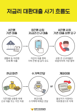 °æÂûÀÌ ¹àÈù ¡®Àú±Ý¸® ´ëȯ´ëÃ⡯ ±¸Ã¼Àû ¹üÇà¿¡ µû¸£¸é ÇÑ »ç¶÷ÀÌ Àüȸ¦ °É¾î¿Í ±ÝÀ¶±â°üÀ» »çĪ, Àú±Ý¸® ´ëÃâÀ» ÇØÁÙ °Íó·³ ÇÇÇØÀÚ¿¡°Ô Á¢±ÙÇÏ´Â ¹æ½ÄÀÌ´Ù. ÀÌ »ç¶÷À» ÅëÇØ AÀºÇà (¾Ç¼º)¾ÛÀ» ¼³Ä¡ÇÏ°Ô Çϰí ÀÌ ¾ÛÀ» ÅëÇØ ´ëÃâ½Åû¼¸¦ ÀÛ¼º¡¤Àü¼Û¹Þ¾Æ ÇÇÇØÀÚÀÇ ±âÁ¸ ´ëÃâ Á¤º¸¸¦ ÃëµæÇÑ´Ù.