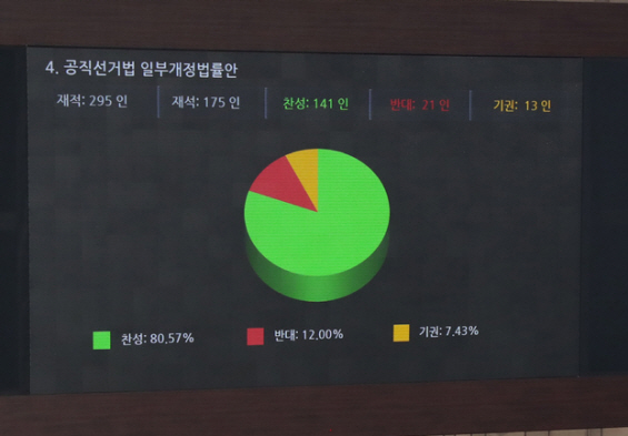 º»È¸ÀÇ Ç¥°á °á°ú, Àç¼® ÀÇ¿ø 175¸í Áß Âù¼º 141¸í, ¹Ý´ë 21¸í, ±â±Ç 13¸íÀ¸·Î °¡°áÇß´Ù.