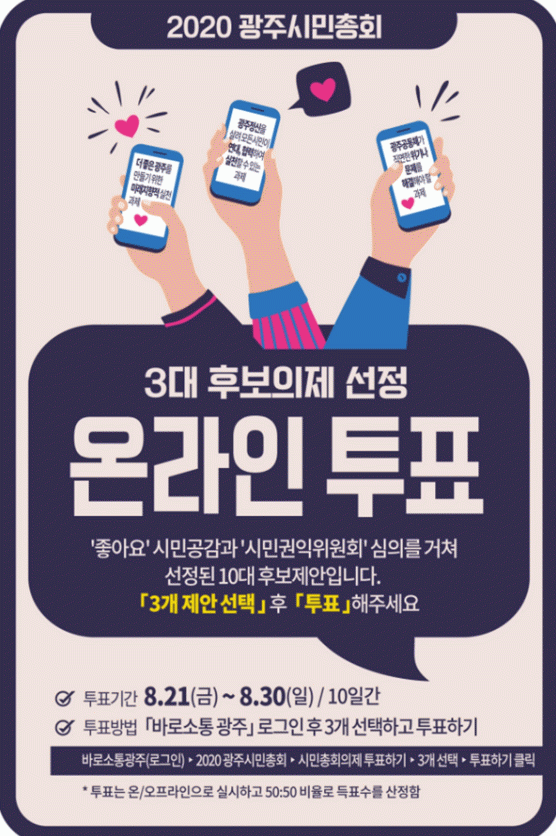 10´ë ¿¹ºñÀÇÁ¦´Â À̹ø ¿Â¡¤¿ÀÇÁ¶óÀÎ ½Ã¹ÎÅõÇ¥¸¦ °ÅÃÄ 3´ë Èĺ¸ÀÇÁ¦·Î ¼±Á¤µÇ¸ç, ¿À´Â 9¿ù12ÀÏ ¿¸± ¿¹Á¤ÀÎ ¡®2020 ±¤ÁֽùÎÃÑȸ¡¯¿¡¼ ½Ã¹ÎÀÇ ¼÷ÀÇ¿Í Åä·Ð, ÅõÇ¥¸¦ ÅëÇØ ¡®±¤ÁÖ°øµ¿Ã¼ ½ÇõÀ» À§ÇÑ ÃÖÁ¾ÀÇÁ¦¡¯·Î ¼±Á¤µÈ´Ù.