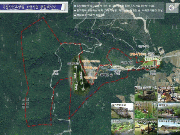 ±âÂù ÀÚ¿¬È޾縲Àº ±â Á¶¼ºµÈ »ê¸²¿åÀå, »ýŽ£ ¹× »ç¹æ´ï µî°ú ¿¬°èÇØ 46haÀÇ »ê¸²¿¡ 70¿©¾ï¿øÀ» ÅõÀÔÇÏ¿© Á¶¼ºÇÒ ÀÚ¿¬È޾縲À¸·Î ÈÞ¾çÈ¿°ú¸¦ ±Ø´ëÈÇϰí, Å©°Ô 2°¡Áö Å׸¶·Î ±¸ºÐµÈ °ø°£À¸·Î Á¶¼ºÇÒ °èȹÀÌ´Ù.