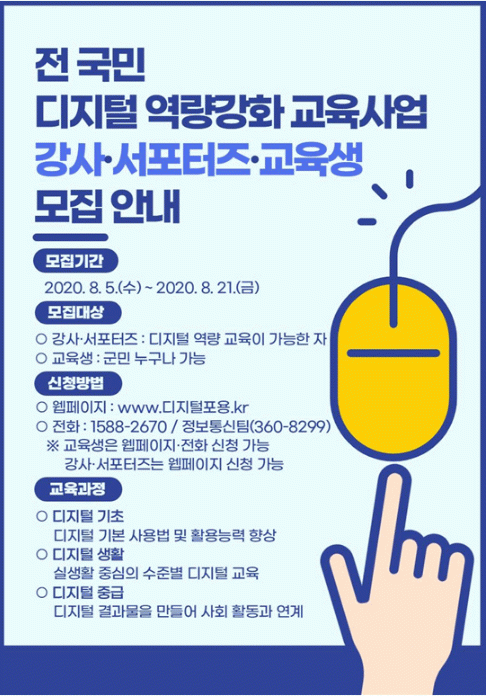 ½ÅûÀº 8¿ù 21ÀϱîÁö Çѱ¹Á¤º¸ÈÁøÈï¿ø ȨÆäÀÌÁö(www.µðÁöÅÐÆ÷¿ë.kr) ¶Ç´Â ÀüÈ(1588-2670)¸¦ ÅëÇØ °¡´ÉÇÏ´Ù. ƯÈ÷ ±³À°»ý »Ó ¾Æ´Ï¶ó °»ç¿Í ¼Æ÷ÅÍÁîµµ ¸ðÁýÇϰí ÀÖÀ¸¹Ç·Î °ü½É ÀÖ´Â »ç¶÷À̶ó¸é ³õÄ¡Áö ¾Ê¾Æ¾ß ÇÑ´Ù. ±âŸ ÀÚ¼¼ÇÑ »çÇ×Àº °î¼º±ºÃ» Á¤º¸Åë½ÅÆÀ(061-360-8299)À¸·Î ¹®ÀÇÇÏ¸é µÈ´Ù.
