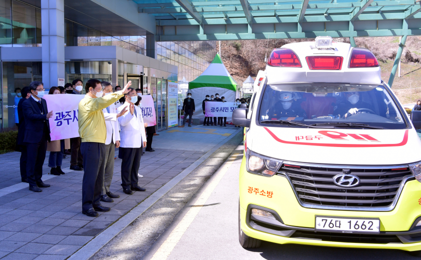 ºû°íÀ»Àü³²´ëº´¿ø¿¡¼ Äڷγª19 Ä¡·á¸¦ ¹Þ°í Åð¿øÇÑ ´ë±¸°æÁõȯÀÚ °¡Á·4¸íÀÌ 11ÀÏ À̿뼷 ½ÃÀå°ú º´¿øÃø ȯ¼ÛÀ» ¹ÞÀ¸¸ç ´ë±¸·Î µ¹¾Æ°¬´Ù. ±¤ÁÖ±¤¿ª½Ãû Á¦°ø.