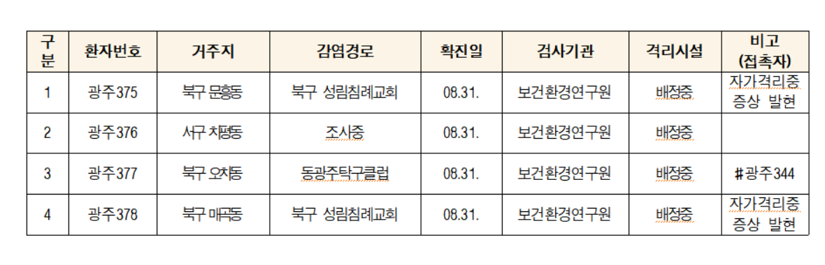 1ÀÏ ¿ÀÀü ÇöÀç Äڷγª19 ´©Àû È®ÁøÀÚ´Â ±¤ÁÖ 378¸í, Àü³² 146¸í¿¡ À̸¥´Ù.