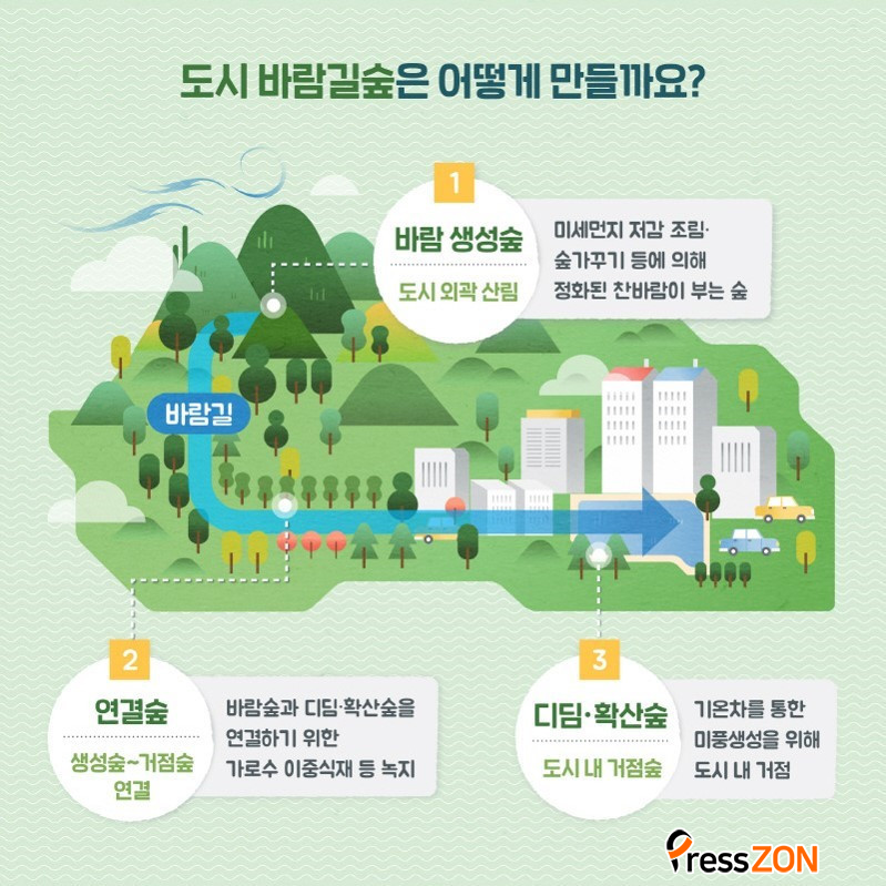±¤Áֽô µµ½Ã ¿Ü°û »êÁö, µµ½Ã ³» °ø¿ø, ³ìÁö´ë µî µµ½Ã°ø°£ÀÇ ÁöÇüÀû Á¶°Ç¿¡ µû¶ó ÀÚ¿¬ÀûÀ¸·Î ¹ß»ýÇÏ´Â Âù°ø±â°¡ »ýȰ±Ç ÁÖ°ÅÁö¿ª±îÁö À¯À﵃ ¼ö ÀÖ´Â Åë·Î¸¦ ¸¸µé°í °ø±â¼øÈ¯À» À¯µµÇØ ¹Ì¼¼¸ÕÁö Àú°¨°ú µµ½Ã¿¼¶ ¿ÏÈ¿¡ ±â¿©ÇÏ´Â µµ½Ã½£À» Á¶¼ºÇÒ °èȹÀÌ´Ù.
