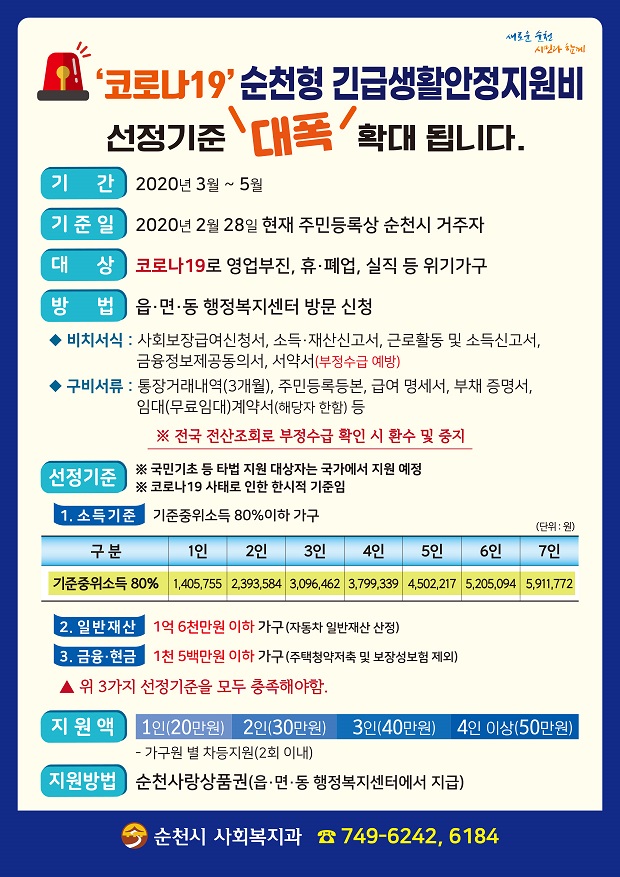 Àü³² ¼øÃµ½Ã´Â ‘¼øÃµÇü ±ä±Þ»ýȰ¾ÈÁ¤Áö¿øºñ’ ¼Ò¿ä¿¹»ê 25¾ï ¿øÀ» È®º¸, Äڷγª19 ´ëÀÀ ‘¼øÃµÇü ±ä±Þ»ýȰ¾ÈÁ¤Áö¿øºñ’ ¼±Á¤±âÁØÀ» ´ëÆø È®´ëÇÑ´Ù.