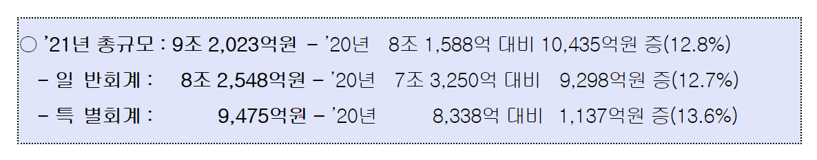 ÀÌ´Â ¿ÃÇØ º»¿¹»ê º¸´Ù 12.8%(1Á¶ 435¾ï¿ø)°¡ Áõ°¡µÈ ±Ô¸ð·Î, Àü¶ó³²µµ´Â ¿ÃÇØ Á¦2ȸ Ã߰濹»ê¿¡ À̾î 2021³â º»¿¹»êµµ 9Á¶¿ø´ë ¿¹»êÀ» Æí¼ºÇÔÀ¸·Î½á, È®ÀåÀû ÀçÁ¤ ÅõÀÔÀ» ÅëÇØ Áö¿ª°æÁ¦¿¡ Ȱ·ÂÀ» ºÒ¾î ³ÖÀ» °èȹÀÌ´Ù.