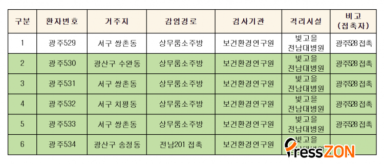 11ÀÏ ¹ã ¼±¸ Ä¡Æòµ¿ »ó¹«Áö¿ª ·ë¼ÒÁֹ濡¼ ±¤ÁÖ528¹ø È®ÁøÀÚ¸¦ Á¢ÃËÇÑ °¨¿°ÀÚ°¡ 5¸íÀ̳ª ¹ß»ýÇϰí, Àü³² È®ÁøÀÚ 201¹øÀ» Á¢ÃËÇØ È®ÁøµÈ 1¸íÀÌ Ãß°¡µÅ Àü³²Áö¿ª °¨¿°¿øÀÌ ±¤ÁÖ·Î ¹øÁö´Â È帧ÀÌ´Ù.