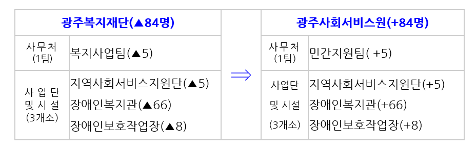 À̸¦ À§ÇØ Àç´Ü »ç¹«Ã³ÀÇ º¹Áö»ç¾÷ÆÀ(5¸í) ±â´ÉÀ» »çȸ¼ºñ½º¿ø ¹Î°£Áö¿øÆÀÀ¸·Î À̰üÇϰí, Áö¿ª»çȸ¼ºñ½º Áö¿ø´Ü(5¸í), Àå¾ÖÀκ¹Áö°ü(66¸í), Àå¾ÖÀκ¸È£ÀÛ¾÷Àå(8¸í) 3°³ ½Ã¼³(84¸í) µîÀ» »çȸ¼ºñ½º¿ø »êÇÏ·Î À̰üÇÑ´Ù.