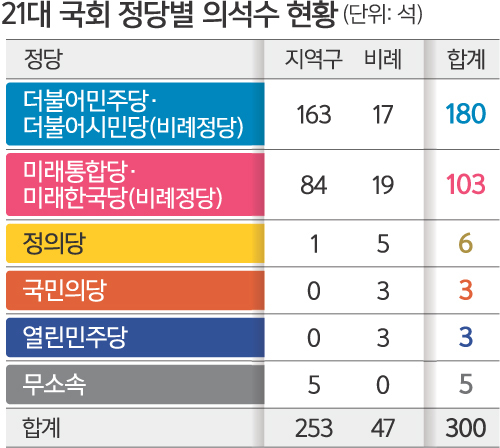 ´õºÒ¾î¹ÎÁÖ´ç°ú ´õºÒ¾î½Ã¹Î´çÀÌ Á¦21´ë ±¹È¸ÀÇ¿ø ¼±°Å¿¡¼ Àüü ÀǼ®(300¼®)ÀÇ 5ºÐÀÇ 3ÀÎ 180¼®À» Â÷ÁöÇß´Ù.