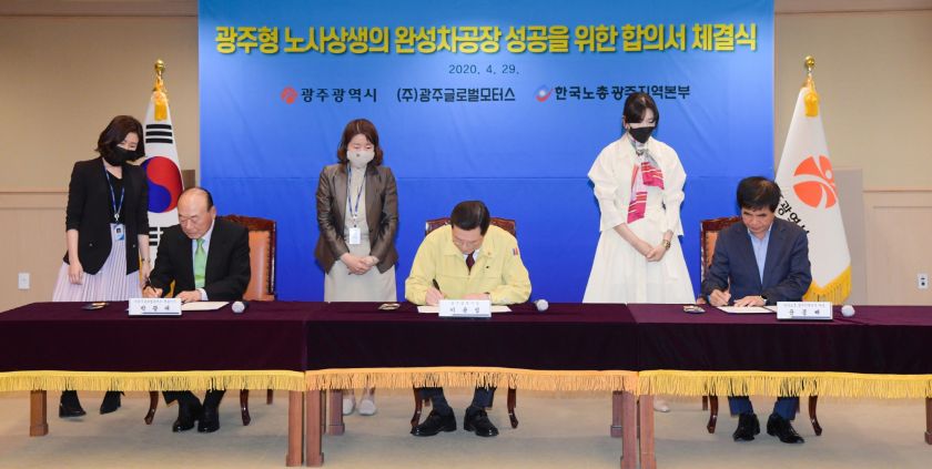 À̿뼷 ±¤ÁÖ±¤¿ª½ÃÀå°ú ¹Ú±¤Å ¢ß±¤Áֱ۷ιú¸ðÅͽº ´ëÇ¥ÀÌ»ç, À±Á¾ÇØ Çѱ¹³ëÃÑ ±¤ÁÖÁö¿ªº»ºÎ ÀÇÀåÀº 29ÀÏ ¿ÀÈÄ ±¤ÁÖ½Ãû ºñÁî´Ï½º·ë¿¡¼ ‘±¤ÁÖÇü ³ë»ç»ó»ýÀÇ ¿Ï¼ºÂ÷°øÀå ¼º°øÀ» À§ÇÑ ÇÕÀǼ’¸¦ ¹ßÇ¥Çß´Ù.