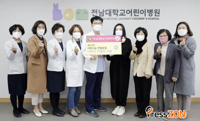 À¯Çý¼÷ ÇаúÀåÀ» ºñ·ÔÇÑ °£È£Çаú ±³¼öµé°ú 3Çгâ Çлý ´ëÇ¥´Â À̳¯ Àü³²´ëº´¿ø °ø°øº¸°ÇÀÇ·á»ç¾÷½Ç(½ÇÀå ±èÀ¯ÀÏ È£Èí±â³»°ú ±³¼ö)À» ¹æ¹®, ÀçÇлýµéÀ» ´ë»óÀ¸·Î ÆîÄ£ ¡®36.5¢ªC »ç¶û³ª´® ÇåÇ÷¿îµ¿¡¯À» ÅëÇØ ¸¶·ÃÇÑ ÇåÇ÷ÁõÀ» Àü´ÞÇß´Ù.