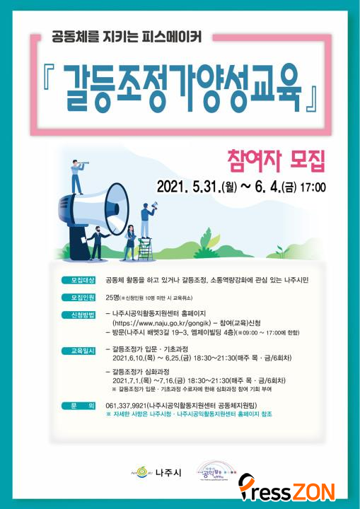 [ÇÁ·¹½ºÁ¸] ³ªÁֽðøÀÍȰµ¿Áö¿ø¼¾ÅÍ(ÀÌÇÏ ¼¾ÅÍ)´Â °Ç°ÇÑ Áö¿ª °øµ¿Ã¼¸¦ À§ÇÑ ¡®°¥µîÁ¶Á¤°¡ ¾ç¼º±³À°¡¯ Âü°¡ÀÚ¸¦ ÀÌ´Þ 31ÀϺÎÅÍ 6¿ù 4ÀϱîÁö ¸ðÁýÇÑ´Ù°í 27ÀÏ ¹àÇû´Ù.