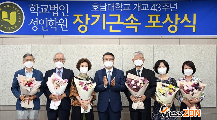 [ÇÁ·¹½ºÁ¸] °³±³ 43ÁÖ³âÀ» ¸ÂÀº Çб³¹ýÀÎ ¼ºÀÎÇпø È£³²´ëÇб³(ÀÌ»çÀå ¹Ú±âÀÎ)´Â 15ÀÏ ¿ÀÀü 10½Ã 30ºÐ ±³¹«À§¿øÈ¸Àǽǿ¡¼ 30³â Àå±â±Ù¼Ó ±³Á÷¿ø 6¸í¿¡ ´ëÇÑ Àå±â±Ù¼Ó Æ÷»ó½ÄÀ» °®°í ±×µ¿¾ÈÀÇ ³ë°í¸¦ °Ý·ÁÇß´Ù.