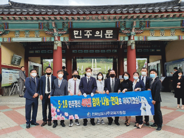 ¿ÀÀü Çà»ç¿¡ ÀÌ¾î ¿ÀÈÄ¿¡´Â Çлý ¿¬ÇÕȸ ´ëÇ¥, ±³À°Âü¿©À§¿øÈ¸À§¿øÀå, ±³À°Áö¿øÃ» Á÷¿øµé°ú ÇÔ²² ±¹¸³ 5¡¤18 ¹ÎÁÖ¹¦Áö¸¦ Âü¹èÇÏ¿´´Ù. ³ªÁÖ±³À°Áö¿øÃ» ±³À°Àå(±è¿µ±æ)Àº ¹æ¸í·Ï¿¡¡®5¡¤18¹ÎÁÖÁ¤½Å Âü¿©¡¤³ª´®¡¤¿¬´ë·Î À̾°Ú½À´Ï´Ù¡¯¶ó°í ±ÛÀ» ³²°å´Ù. À̳¯ Âü¹è´Â 5¡¤18 Èñ»ýÀÚµéÀ» Ã߸ðÇÏ¸ç ¼þ°íÇÑ 5¿ù Á¤½ÅÀ» ±â¸®¸ç, ¹ÎÁֽùÎÀǽİú °øµ¿Ã¼ Á¤½ÅÀ» °è½Â¡¤½ÇõÇϱâ À§ÇØ ÀÌ·ïÁ³´Ù.