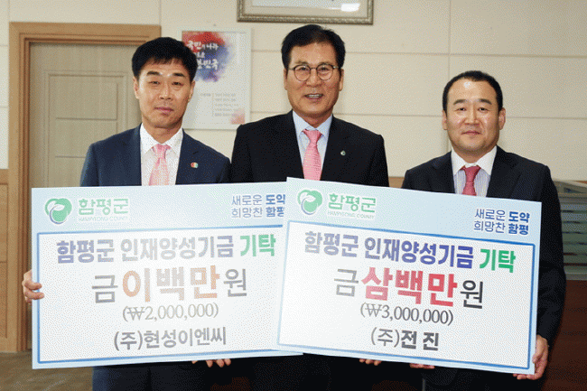 ÇÑÆí À̳¯ ¼ö¿©½Ä¿¡ ¾Õ¼ Áö¿ª »ê´Ü¿¡ ÀÔÁÖÇÑ ¢ßÀüÁø(´ëÇ¥ ±è±â¿¬)°ú ÃâÇâÀλç±â¾÷ ¢ßÇö¼ºÀÌ¿£¾¾(´ëÇ¥ ±è±â¼º)´Â ÇÔÆò±º ÀÎÀç¾ç¼º±â±Ý¿¡ °¢°¢ 300¸¸ ¿ø°ú 200¸¸ ¿øÀ» ±âŹÇß´Ù.