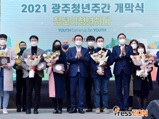 À̳¯ °³¸·½Ä¿¡¼´Â 2021³â ±¤ÁÖû³âÁ¤Ã¥¿¡ ±â¿©ÇÑ À¯°øÀÚ¿¡ ´ëÇÑ ½Ã»ó½Ä, ±¤ÁÖû³âÀÇ Çö½Ç°ú ¹Ì·¡ÀÇ ÀÇÁö¸¦ ´ÙÁüÇÑ Ã»³â¼±¾ð¹®ÀÌ ³¶µ¶µÇ¸ç û³â¿¡°Ô ÈûÀ» ºÏµ¸´Â ¸¶ÀÓÀ̽ºÆ®, µå·ÎÀ× ÄÝ¶óº¸ µî °ø¿¬ÀÌ ÆîÃÄÃÆ´Ù.