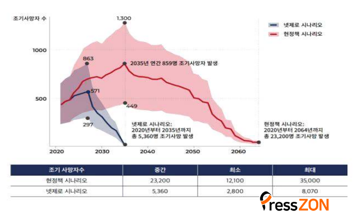 ±¸Ã¼ÀûÀ¸·Î ±¹³» °¡½º¹ßÀü¿¡¼ ³»»Õ´Â ´ë±â¿À¿°¹°Áú·Î 2020³âºÎÅÍ ¿À´Â 2064³â±îÁö 44³â µ¿¾È ÃÑ 2¸¸3õ200¸í(ÃÖ¼Ò 1¸¸2õ100¸í~ÃÖ´ë 3¸¸5õ¸í, ±¹³»¿Ü ÇÇÇØ Æ÷ÇÔ)ÀÌ Á¶±â »ç¸ÁÇÒ °ÍÀ¸·Î ¿¹ÃøÇß´Ù.