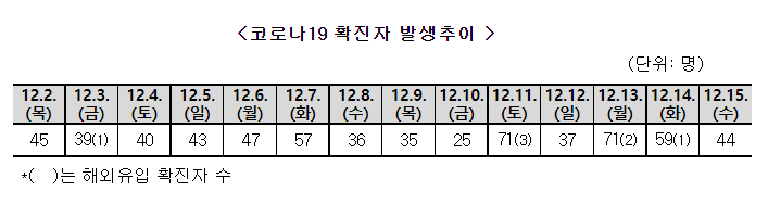 Áö³ 10¿ù ¸» ÀÌÈÄ 7ÁÖ°£ ¹ß»ýÃßÀ̸¦ º¸¸é 13.1¸í(10.28.~11.3.)¡æ20.4¸í(11.4.~11.10.)¡æ23.7¸í(11.11.~11.17.)¡æ46.6¸í(11.18.~11.24.)¡æ42.7¸í(11.25.~12.1.)¡æ43.9¸í(12.2.~12.8.)¡æ48.9¸í(12.9.~12.15.)¿¡ ´ÞÇÑ´Ù.