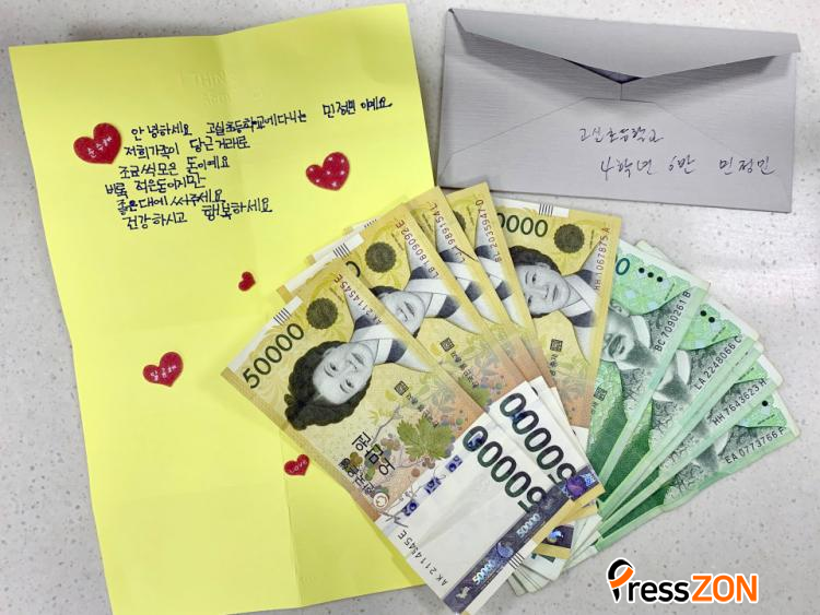 ºÀÅõ¿¡´Â ¡®ÇÏÆ®¡¯ ½ºÆ¼Ä¿°¡ ºÙÀº ³ë¶õ»ö ÆíÁöÁö¿Í 5¸¸ ¿ø ±Ç 5Àå°ú 1¸¸ ¿ø ±Ç 5Àå µî ÃÑ 30¸¸ ¿øÀÇ ÁöÆó°¡ µé¾îÀÖ¾ú´Ù.