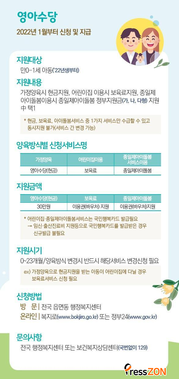 °¡Á¤¿¡¼ ¾çÀ° ½Ã ¸Å¿ù 30¸¸ ¿ø¾¿ Çö±ÝÀ¸·Î Áö¿ø¹ÞÀ» ¼ö ÀÖÀ¸¸ç, ¾î¸°ÀÌÁý ¹× Á¾ÀÏÁ¦ ¾ÆÀ̵¹º½¼ºñ½º ÀÌ¿ë ½Ã¿¡´Â °¢°¢ º¸À°·á ¹Ù¿ìó, Á¾ÀÏÁ¦ ¾ÆÀ̵¹º½ ¹Ù¿ìó·Î Áö¿øµÈ´Ù. ´Ù¸¸, Áߺ¹Áö¿øÀº ºÒ°¡ÇÏ´Ù.