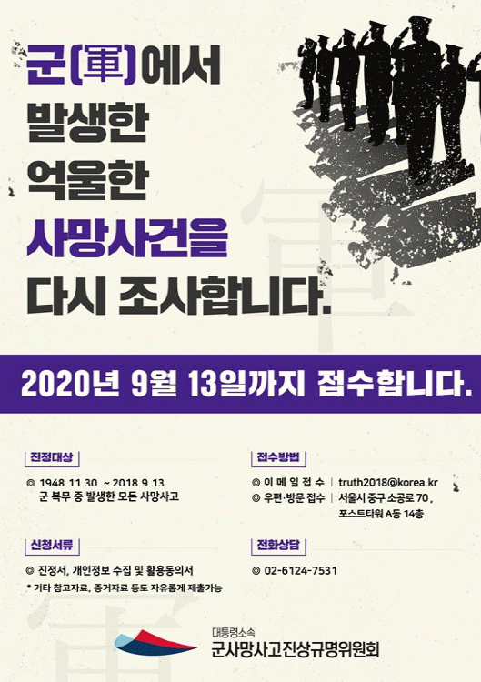 ƯÈ÷, À̹ø À§¿øÈ¸´Â Á¶»ç´ë»ó ±â°£ÀÌ 1948³â 11¿ùºÎÅÍ 2018³â 9¿ù±îÁö ⱺ ÀÌ·¡ ¸ðµç »ç¸Á»ç°í¸¦ ´ë»óÀ¸·Î ÇÑ´Ù. 2014³â ±ºÀλç¹ý °³Á¤À¸·Î ±º º¹¹« Áß ±¸Å¸¡¤°¡È¤ÇàÀ§¡¤¾÷¹«°úÁß µî ºÎ´ëÀûÀÎ ¿äÀÎÀ¸·Î ÀÚÇØ »ç¸Á(ÀÚ»ì)ÇÑ ¶§µµ ±¹°¡ÀÇ Ã¥ÀÓÀ» ÀÎÁ¤ÇØ '¼øÁ÷' °áÁ¤À» ¹ÞÀ» ¼ö ÀÖ´Ù.