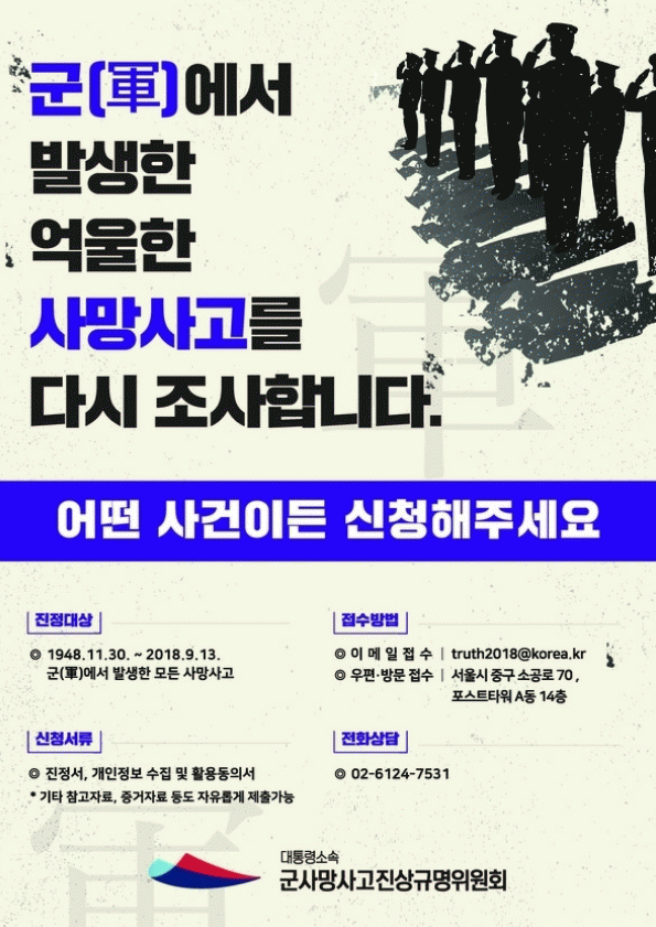 Áø»ó±Ô¸íÀ§¿øÈ¸´Â Ưº°¹ý¿¡ µû¶ó Áö³ 2018³â 9¿ù ¼³¸³µÆÀ¸¸ç 3³âÀÇ È°µ¿±â°£ (2021³â 9¿ù 13ÀÏ Á¾·á)µ¿¾È ±º´ë¿¡¼ ¹ß»ýÇÑ »ç¸Á»ç°í¿¡ ´ëÇØ À¯°¡Á·À̳ª ¸ñ°ÝÀÚ µîÀÇ ÁøÁ¤À» ¹Þ¾Æ °øÁ¤ÇÏ°í °´°üÀûÀÎ Á¶»ç·Î Áø½ÇÀ» ±Ô¸íÇÏ´Â ¾÷¹«¸¦ ¼öÇàÇϰí ÀÖ´Ù.